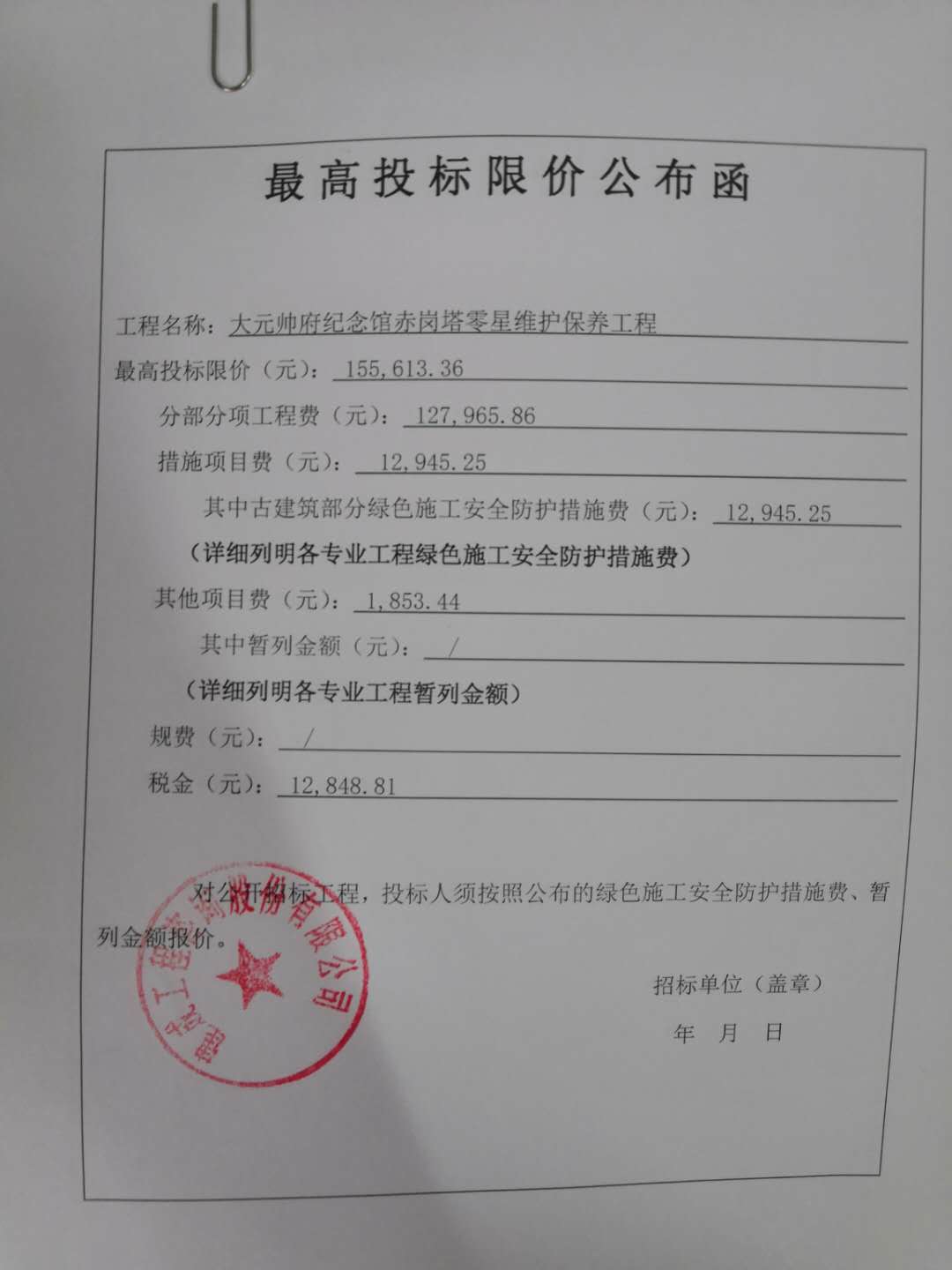 最高投標(biāo)限價(jià)公布函